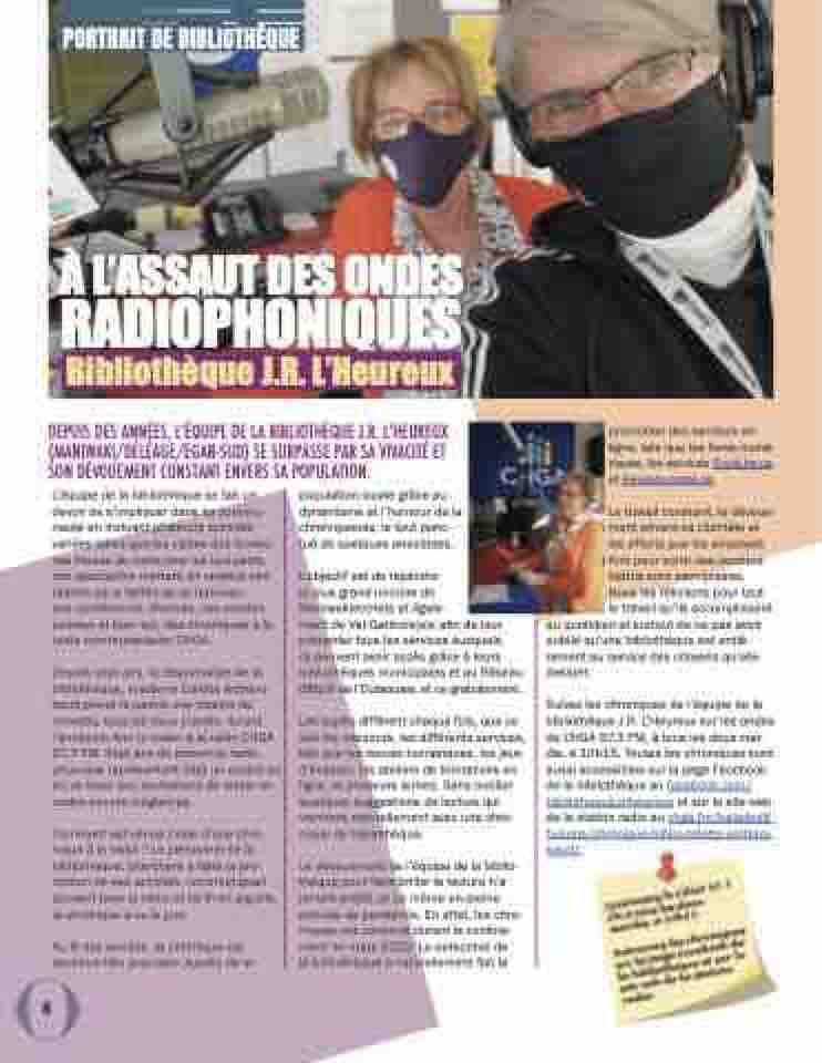 Suivez les chroniques de l’équipe de la bibliothèque J.R. L’Heureux sur les ondes de CHGA 97.3 FM, à tous les deux mar- dis, à 10h15. Toutes les chroniques sont aussi accessibles sur la page Facebook de la bibliothèque au facebook.com/ bibliotheque.jrlheureux et sur le site web de la station radio au chga.fm/baladodif- fusions/chronique-biblio-colette-archam- bault/.