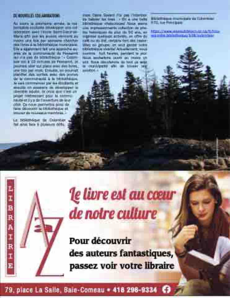 mais Claire Savard n’a pas l’intention de baisser les bras : « On a une belle bibliothèque chaleureuse! Nous avons une impressionnante collection de pho- tos historiques de plus de 50 ans, on organise quelques activités, on offre du café ou du thé, certains font des casse- têtes en groupe; on veut garder notre bibliothèque vivante! Actuellement, nous ouvrons huit heures, pendant le jour. Nous souhaitons ouvrir au moins un soir. Nous discuterons de tout ça avec la municipalité afin de trouver une solution. »