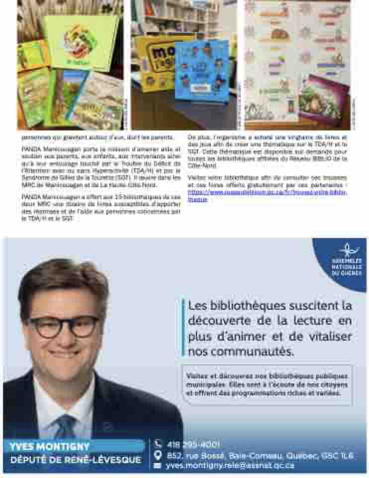 PANDA Manicouagan a offert aux 15 bibliothèques de ces deux MRC une dizaine de livres susceptibles d’apporter des réponses et de l’aide aux personnes concernées par le TDA/H et le SGT.