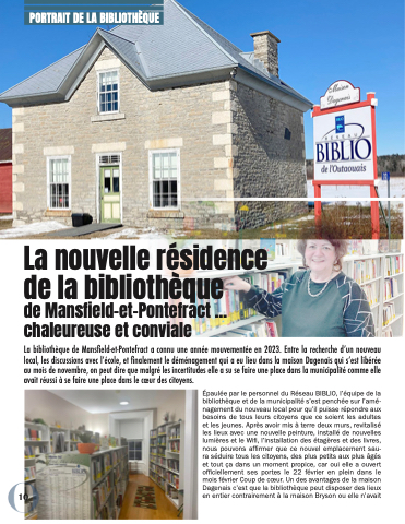 La bibliothèque de Mansfield-et-Pontefract a connu une année mouvementée en 2023. Entre la recherche d’un nouveau local, les discussions avec l’école, et finalement le déménagement qui a eu lieu dans la maison Dagenais qui s’est libérée au mois de novembre, on peut dire que malgré les incertitudes elle a su se faire une place dans la municipalité comme elle avait réussi à se faire une place dans le cœur des citoyens.