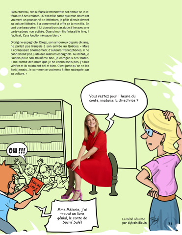 Bien entendu, elle a réussi à transmettre cet amour de la lit- térature à ses enfants. « C’est drôle parce que mon chum est vraiment un passionné de littérature, je pâlis d’envie devant sa culture littéraire. Il a commencé à offrir ça à mon fils. En tant que beau-père, il lui donnait un classique à lire avec une carte-cadeau non activée. Quand mon fils finissait le livre, il l’activait. Ça a fonctionné super bien. »