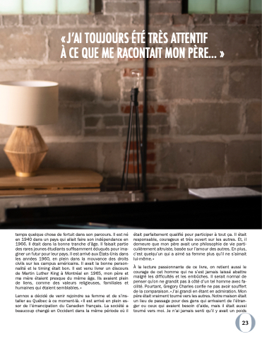 temps quelque chose de fortuit dans son parcours. Il est né en 1940 dans un pays qui allait faire son indépendance en 1966. Il était dans la bonne tranche d’âge. Il faisait partie des rares jeunes étudiants suffisamment éduqués pour ima- giner un futur pour leur pays. Il est arrivé aux États-Unis dans les années 1960, en plein dans la mouvance des droits civils sur les campus américains. Il avait la bonne person- nalité et le timing était bon. Il est venu livrer un discours de Martin Luther King à Montréal en 1965, mon père et ma mère étaient presque du même âge. Ils avaient plein de liens, comme des valeurs religieuses, familiales et humaines qui étaient semblables. »
