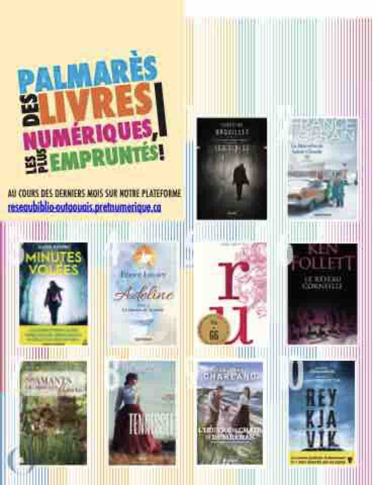 PALMARÈS DES LIVRES NUMÉRIQUES, LES PLUS EMPRUNTÉS! AU COURS DES DERNIERS MOIS SUR NOTRE PLATEFORME reseaubiblio-outaouais.pretnumerique.ca 3456 7 8 9 10 12 6